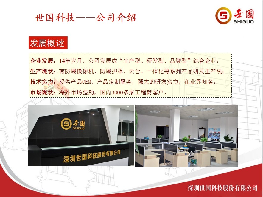 該公司暫無簡介信息  深圳世國科技股份有限公司成立于1999年9月,注冊資本1000萬元,是中國防爆集團(tuán)股份有限公司核心控股企業(yè),深圳市安全防范行業(yè)協(xié)會理事單位。世國科技是一家致力于防爆智能監(jiān)控領(lǐng)域產(chǎn)品研發(fā)、生產(chǎn)、銷售及應(yīng)用集成服務(wù)的高新技術(shù)企業(yè)。產(chǎn)品涉及防爆攝像機(jī)、防爆云臺、防爆護(hù)罩、防爆紅外燈、防爆解碼器、防爆高速球等。